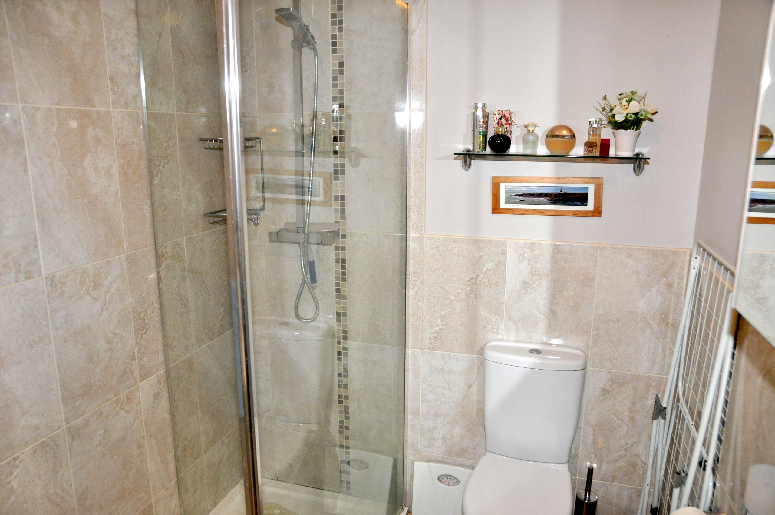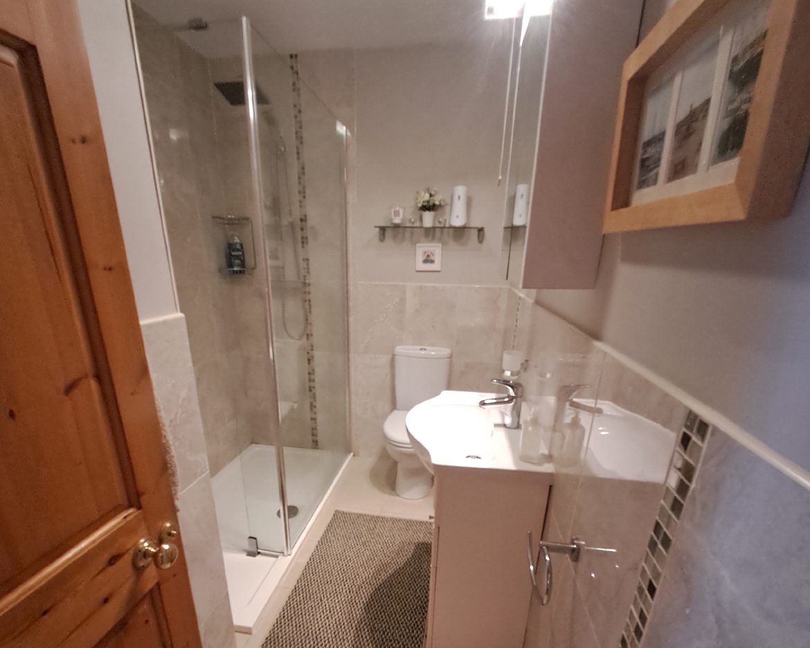 Bathroom                              –   9ft 6in x 6ft non-slip tile flooring, half tiled walls, large glass-enclosed and fully tiled power shower with rainfall head, WC, WHB, medicine cabinet, Dimplex overhead extractor fan & Dimplex wall mounted electric heater.