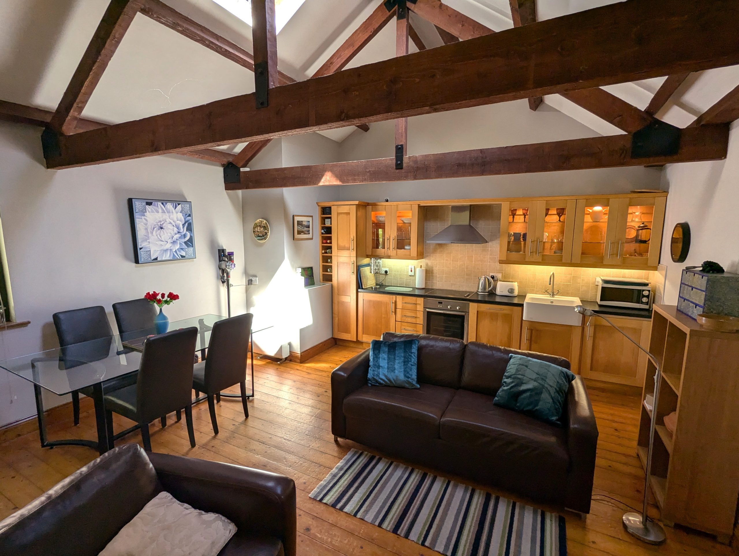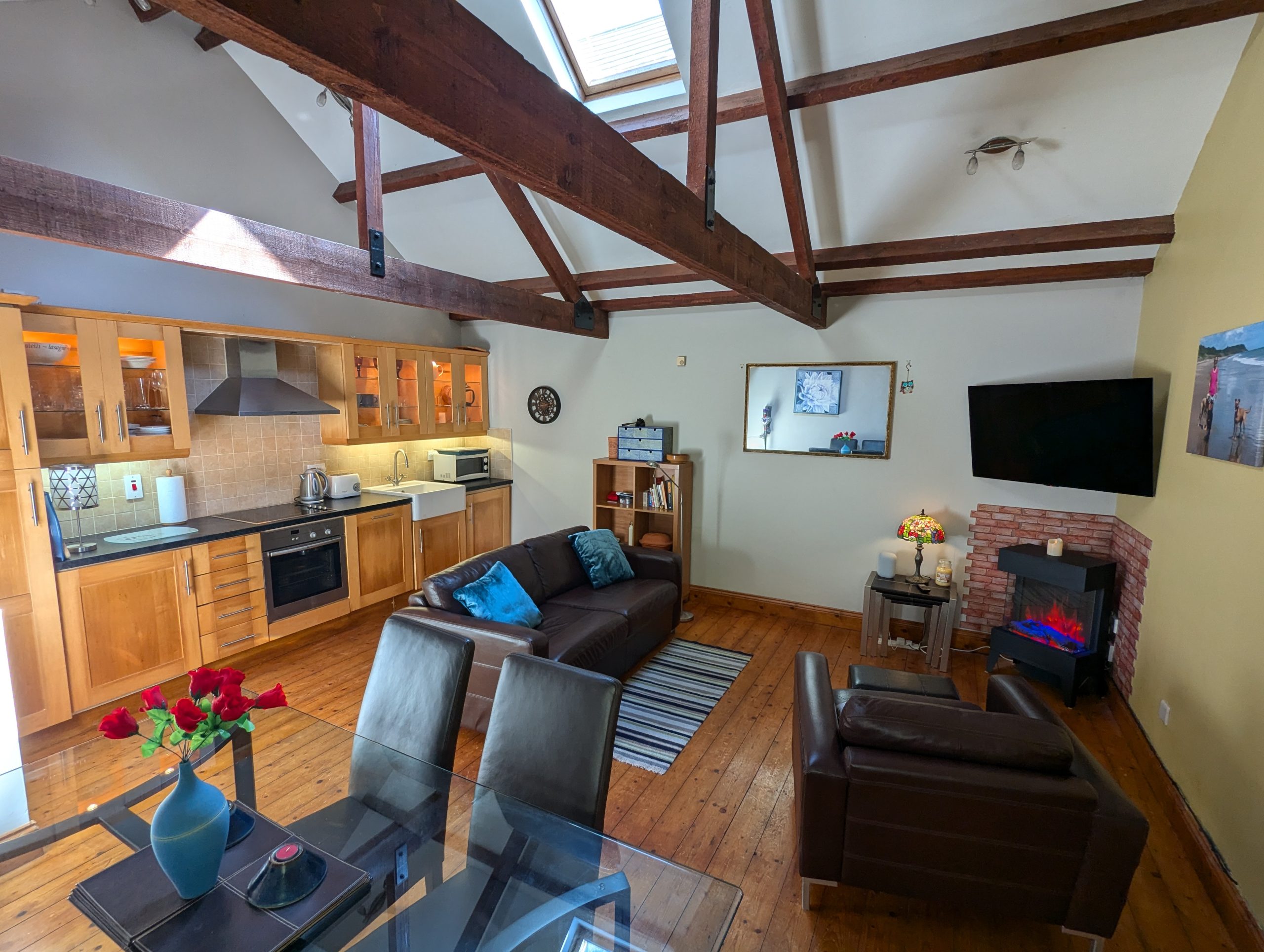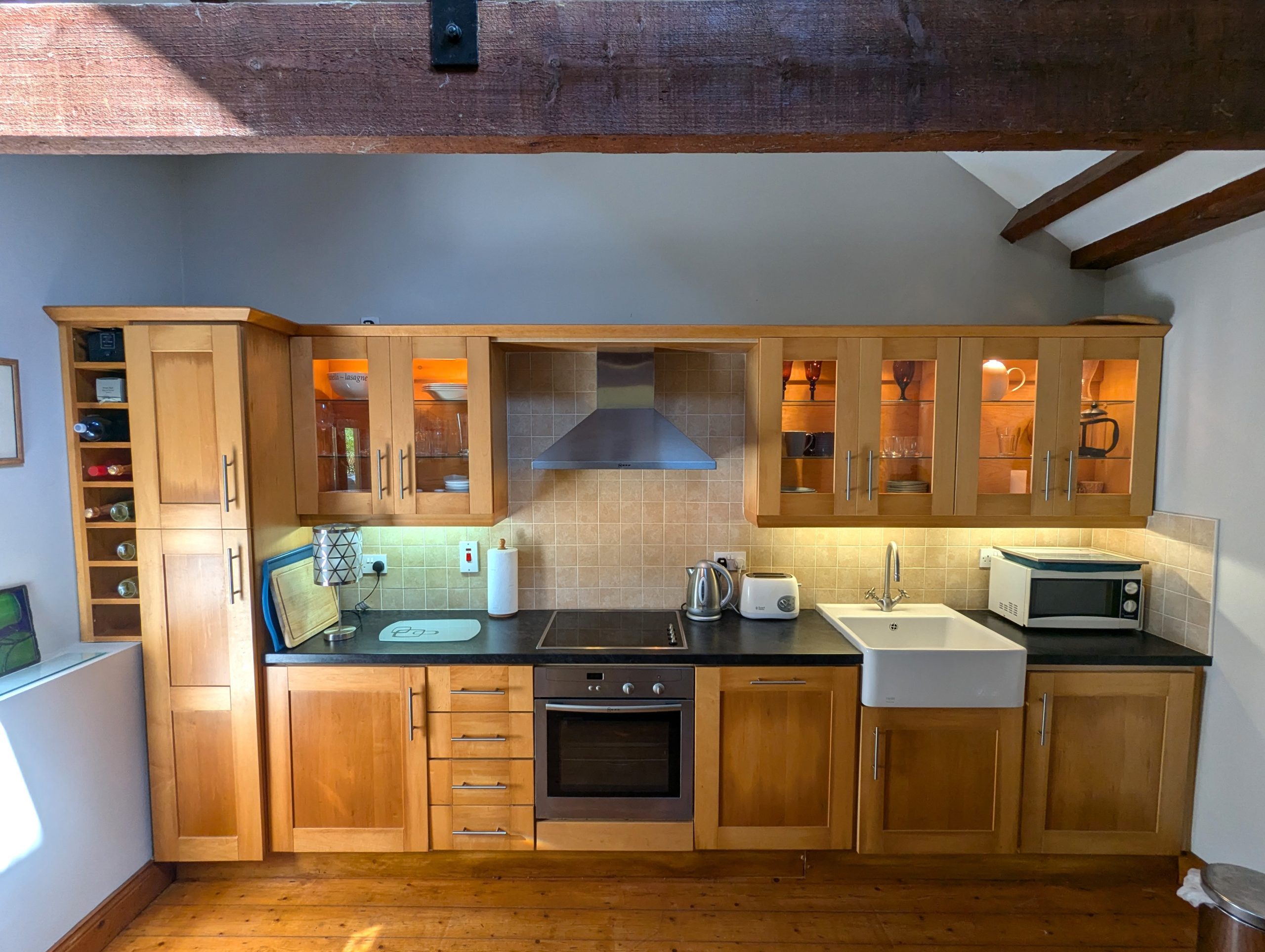 Living/Kitchen/Dining  –  17ft 6in x 15ft 10in spacious and bright open floor plan with solid Pine wood flooring, high vaulted ceiling with exposed wooden beams and 2 skylights, storage heating, fully fitted solid Maple Shaker-style kitchen cabinets with glass plus under-cabinet and in-cabinet lighting, laminate counter tops, tiled splash back, FRANKE Belfast sink, pull out larder, integrated NEFF dishwasher, NEFF fridge/freezer, all NEFF electric oven & hob with extractor fan, integrated Hotpoint washer/dryer with invertor motor, custom wine shelf and hot press.