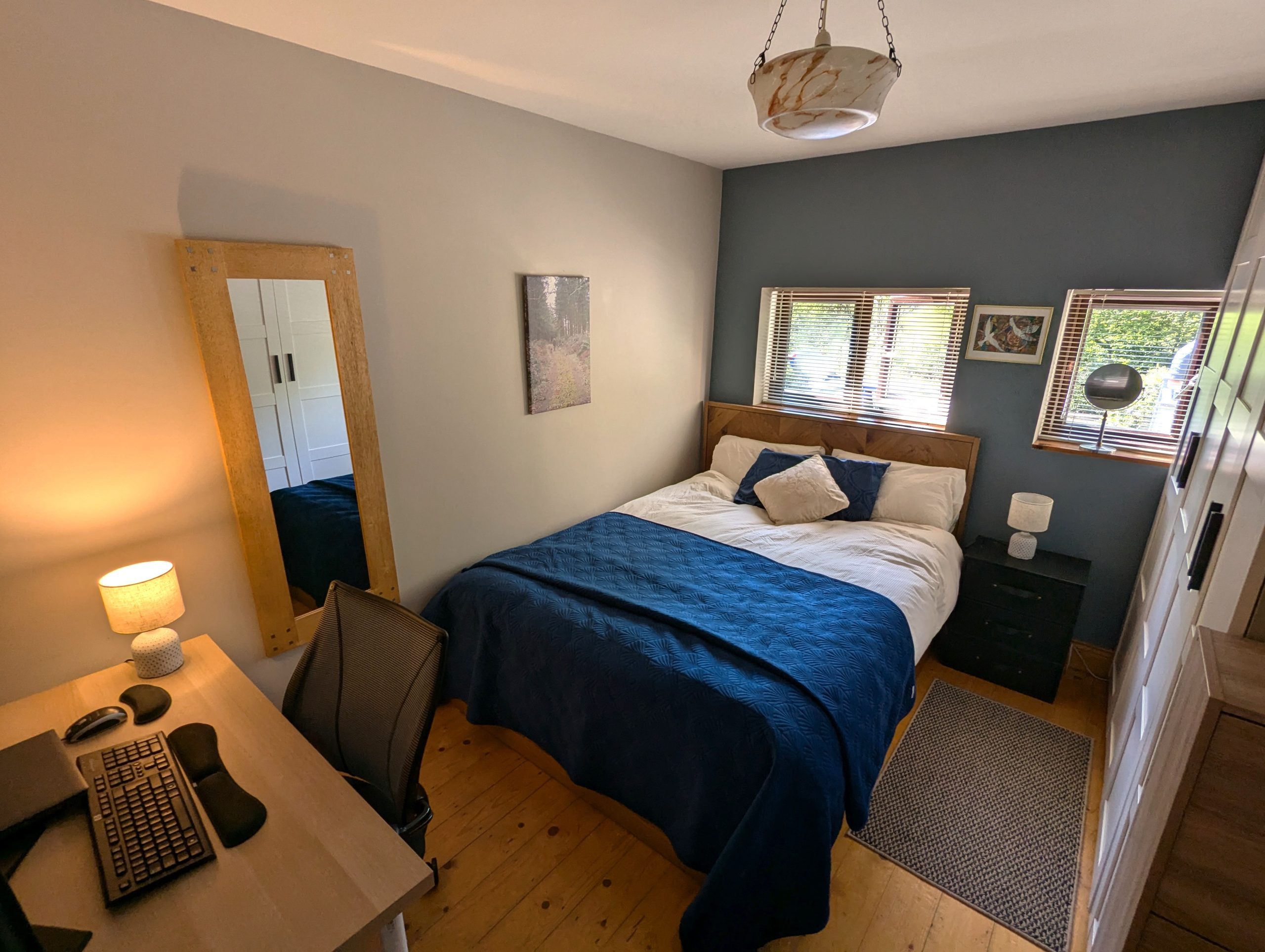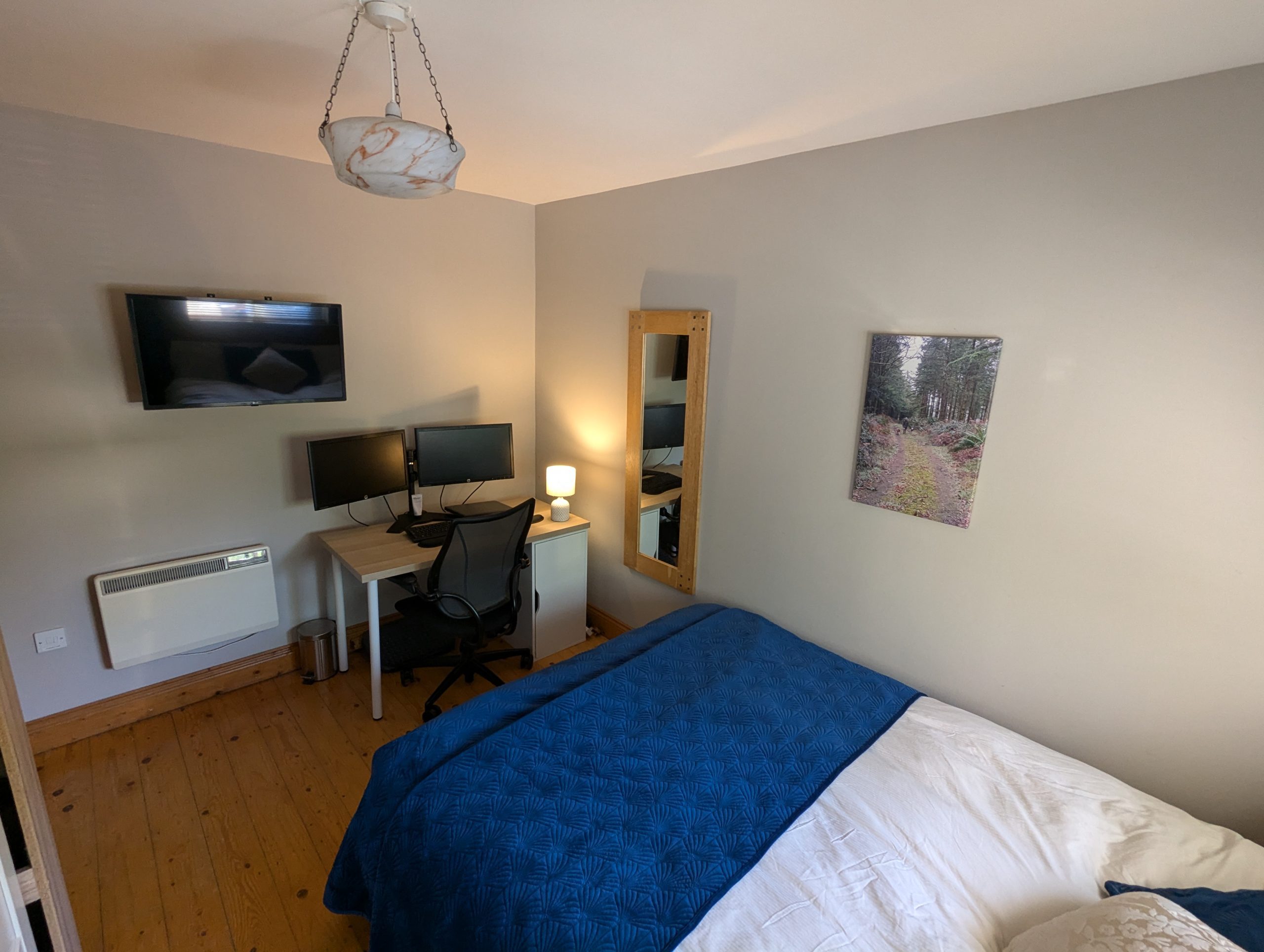 Bedroom                                – 12ft 6in x 9ft 9in solid Pine wood flooring and 2 windows, Dimplex wall-mounted convector radiator.