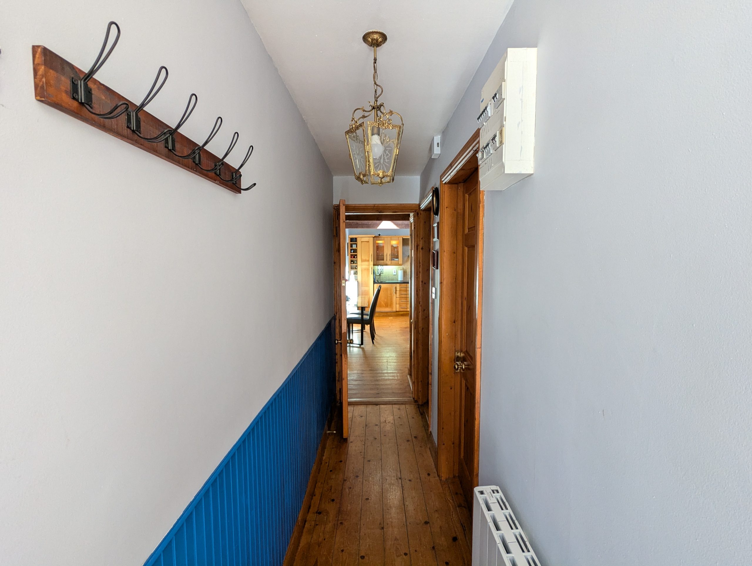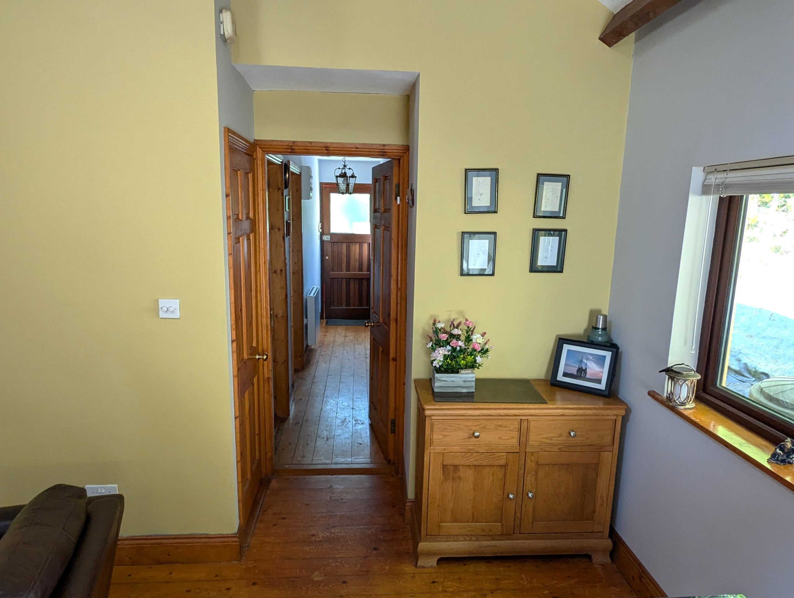 Entry Hallway                     – 15ft 8in x 3ft 2in solid hardwood entrance door with glass, solid Pine wood flooring, ceramic wall mounted radiator, access to attic via Stira stairs.