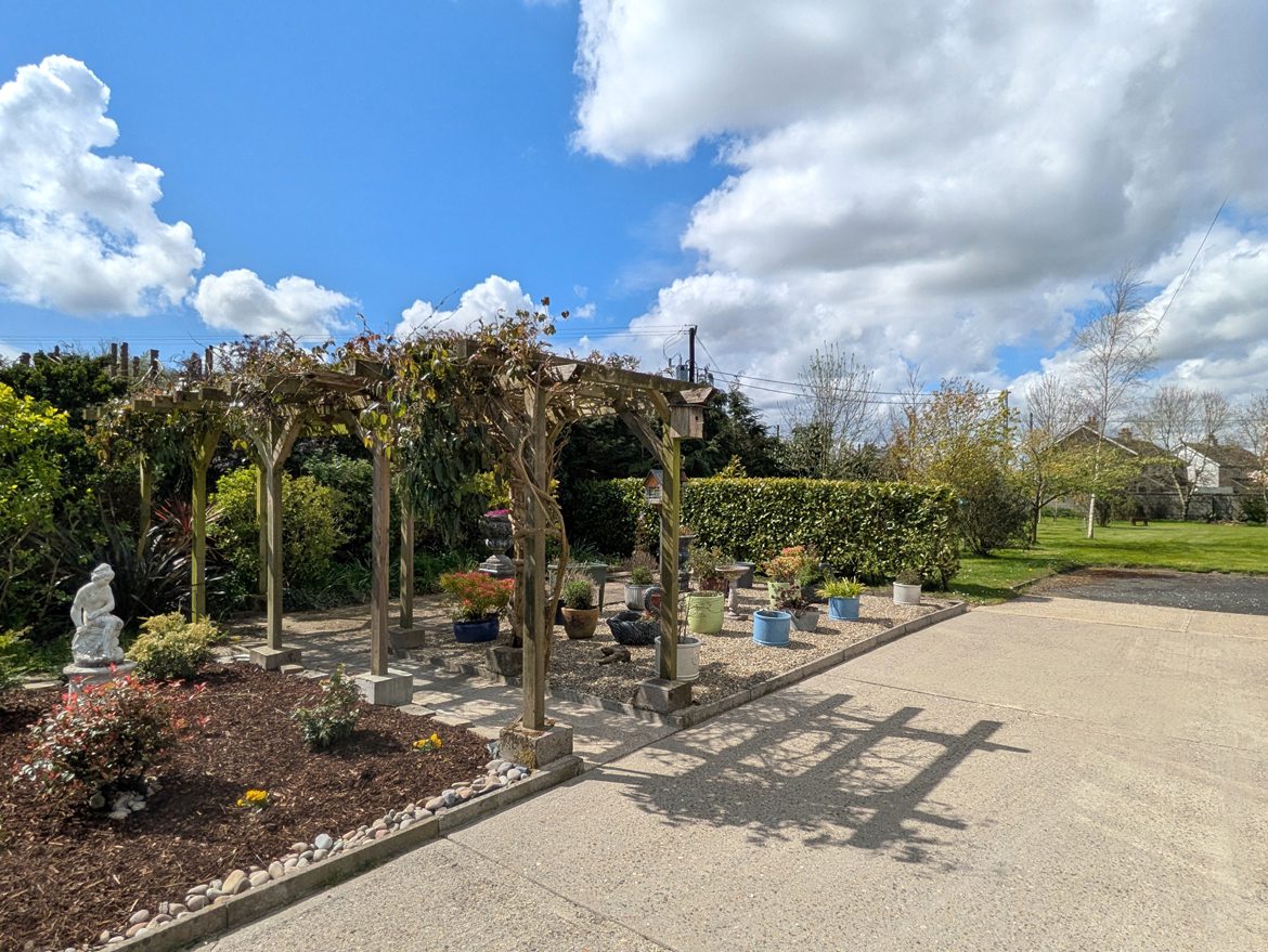This immaculate five-bedroom detached residence, measuring approximately 170 sqm, is situated in the heart of Ballycullane village. The property boasts a large, paved driveway and a spacious front lawn adorned with mature trees, creating a welcoming and picturesque entrance. The residence is designed for both relaxation and outdoor entertainment, featuring several lawn areas, a glass house, and a metal garden shed. A rose and herb garden, pergola, outdoor bar and grill, and a rear concrete yard offer various spaces for leisure and gatherings. The property overlooks beautiful countryside views and includes a substantial detached garage/workshop of approximately 41 sqm. Additionally, there is a side patio area with a pergola for further outdoor enjoyment.