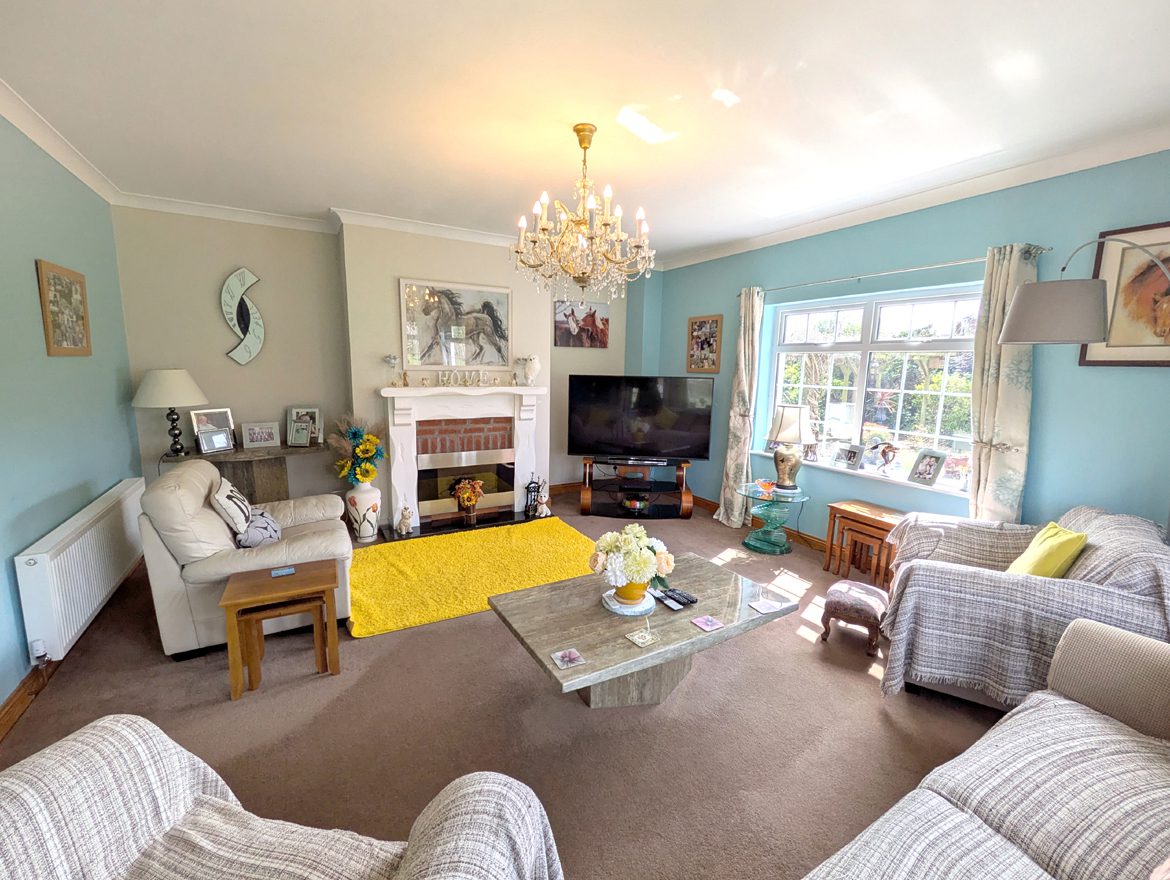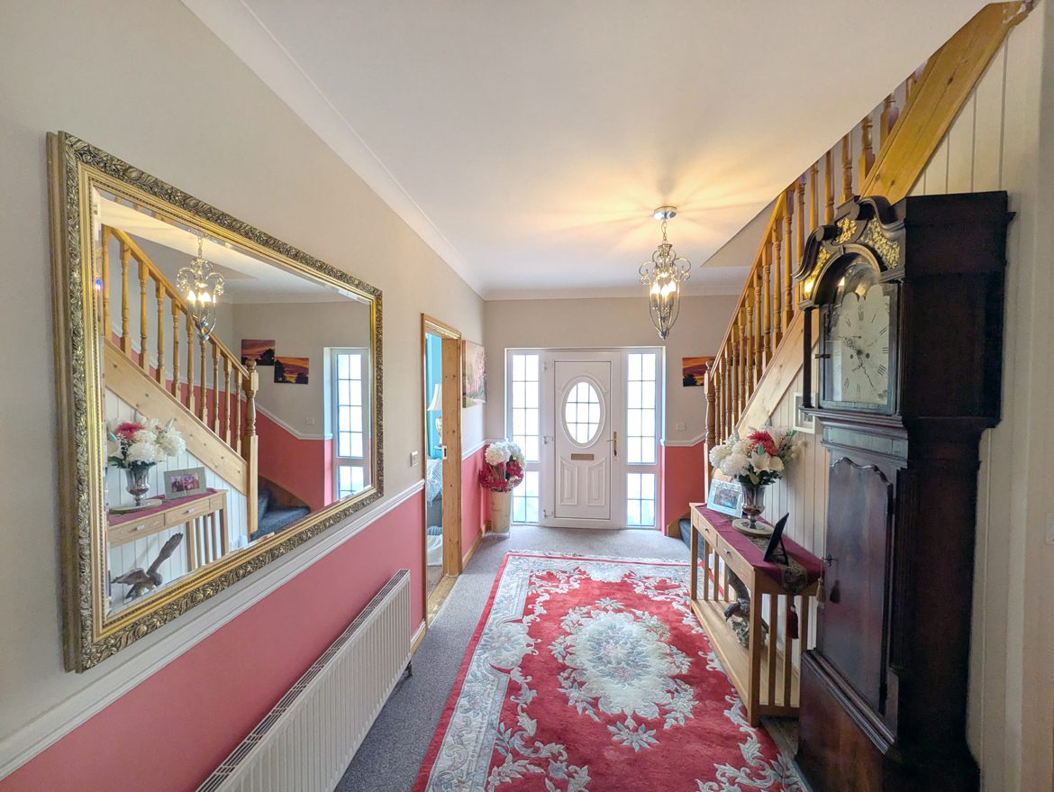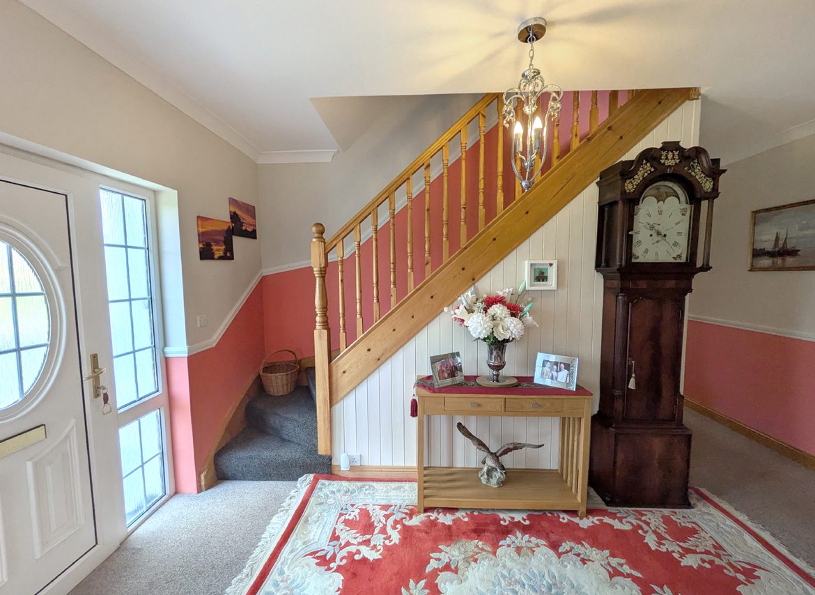 Entrance Hall – 4.76m x 2.18m carpet flooring, white PVC entrance door with glass insert & sidelights, ceiling coving and wooden staircase to top floor with carpet steps and under stairs storage space.