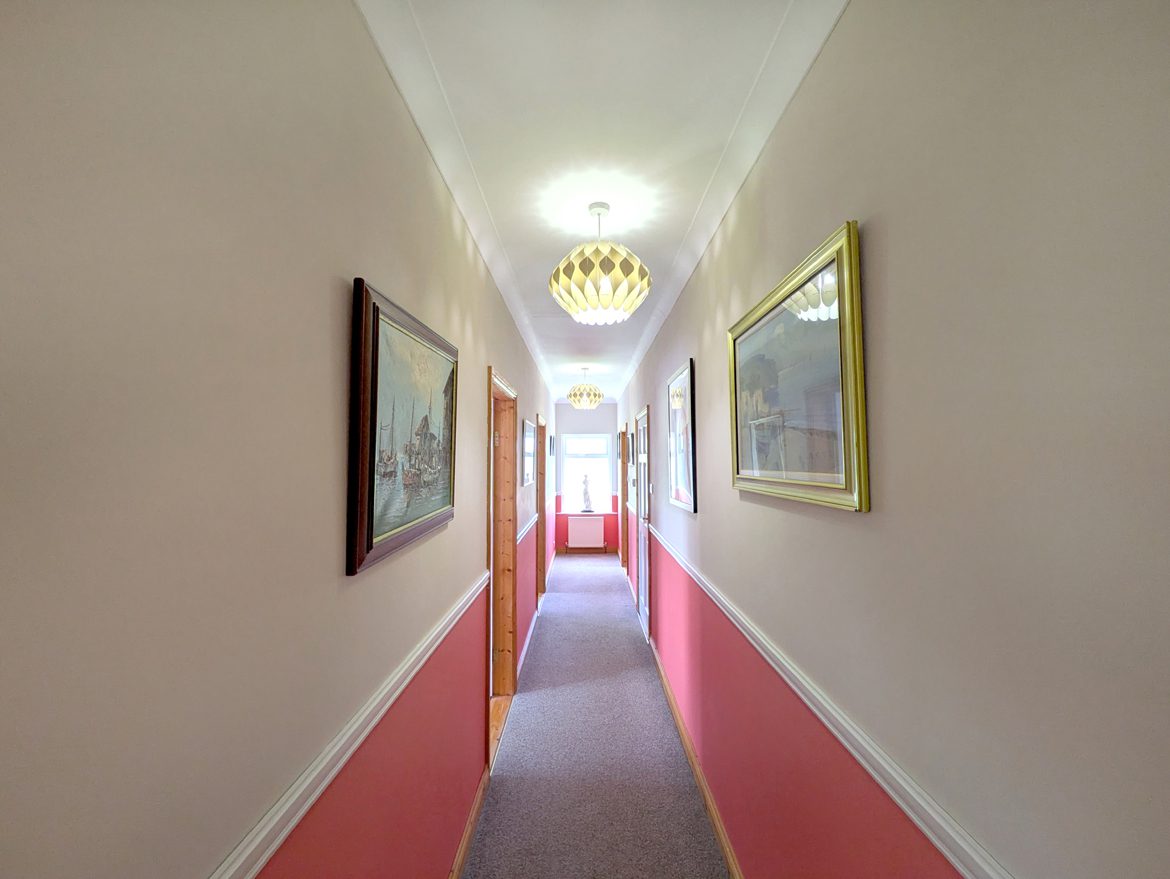 Inner Hallway – 8.58m x 1.07m carpet flooring, ceiling coving and hot press / linen closet.