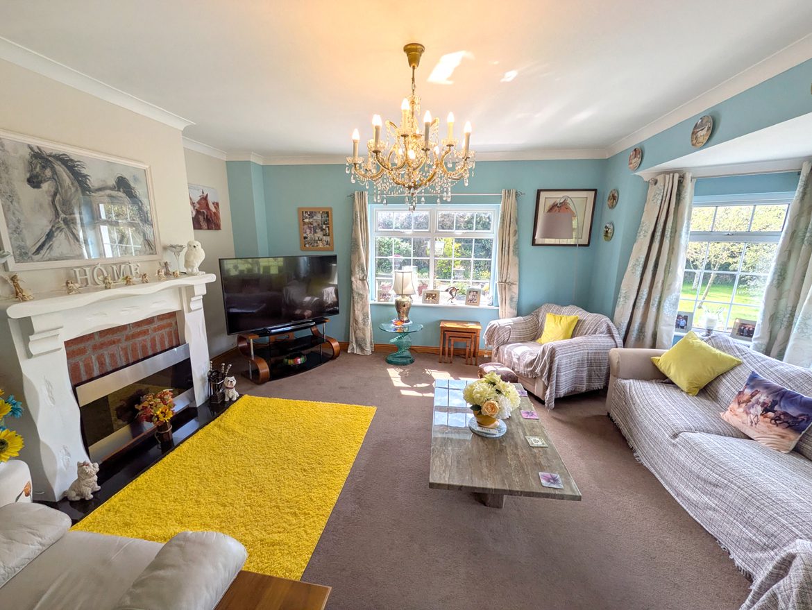 Living Room – 4.95m x 4.84m carpet flooring, ceiling coving, fireplace with electric stove insert, painted wood mantel and granite hearth, large Bay window overlooking front garden and gable window.