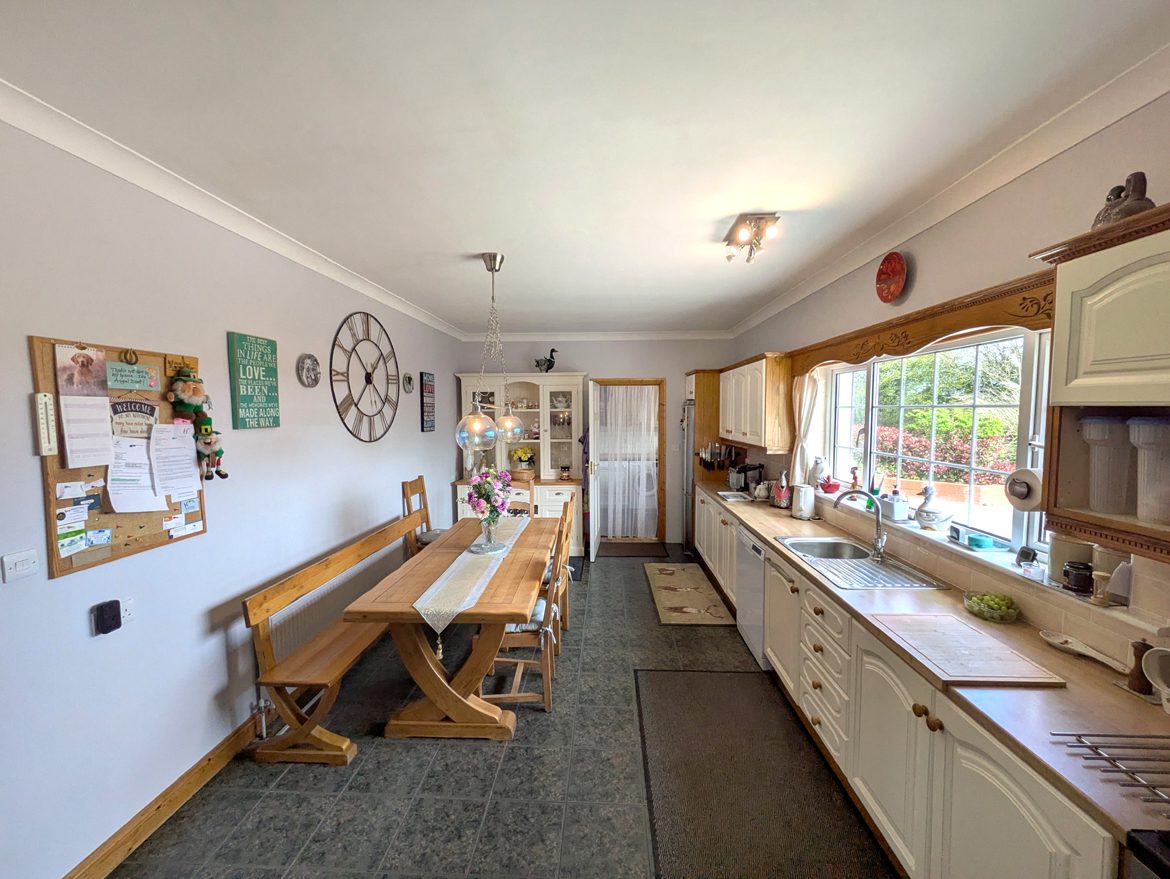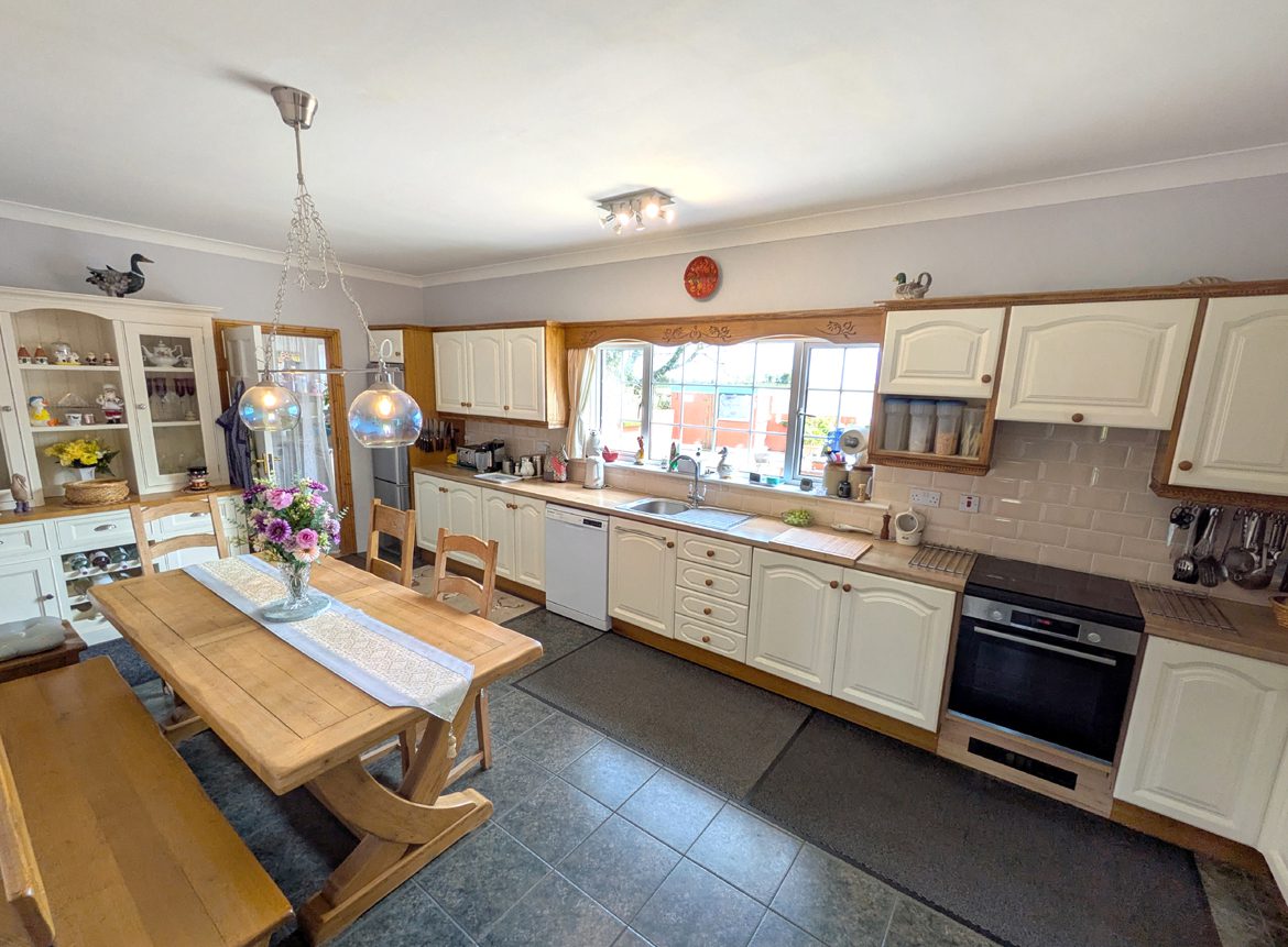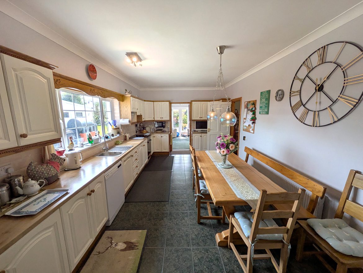 Kitchen / Dining – 6.37m x 3.46m open plan with tile flooring, ceiling coving, solid wood and painted country kitchen, laminate counter tops, stainless sink, tile splash back, integrated electric cooker, dishwasher, fridge/freezer, and door access to utility and formal dining room / family lounge.