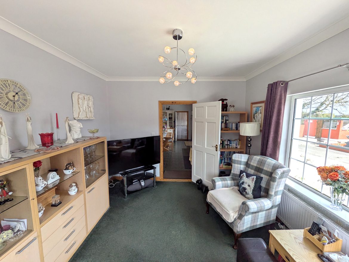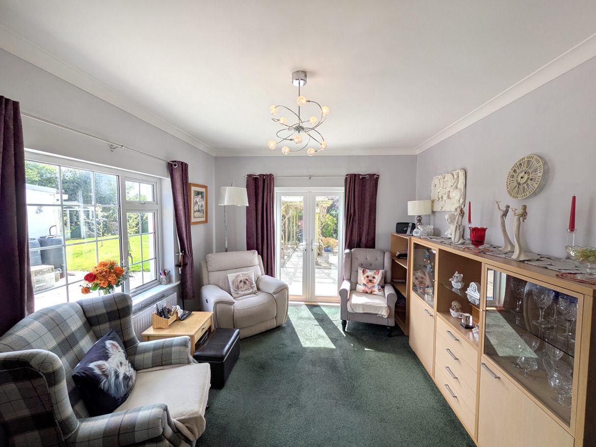 Dining Room – 4.21m x 3.47m currently used as family lounge with carpet flooring, ceiling coving, large windows and French doors to side patio area.