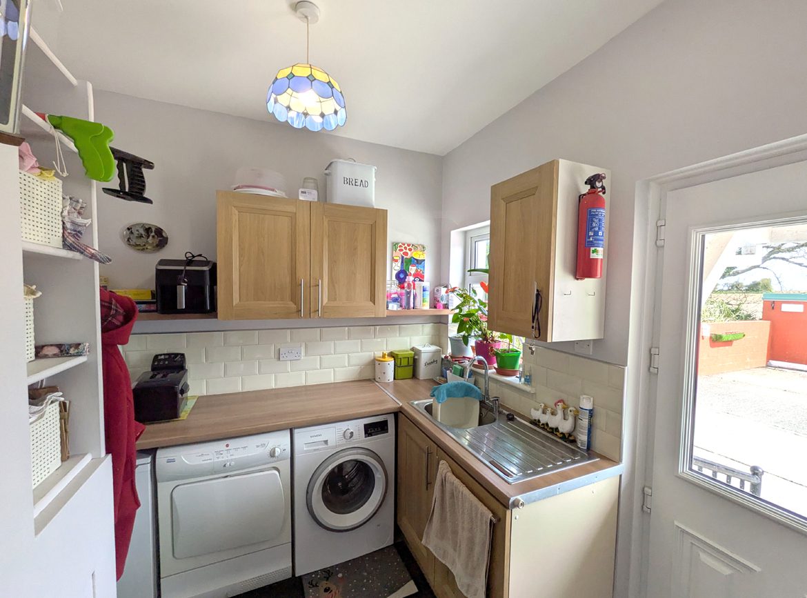 Utility Room – 2.42m x 2.33m laminate flooring, stainless sink unit with laminate countertop and tile splash back, built-in cabinets, washer/dryer hook-up and white PVC back entry door with glass insert.