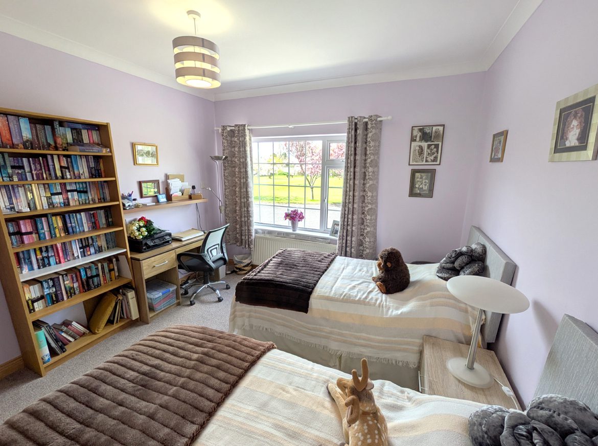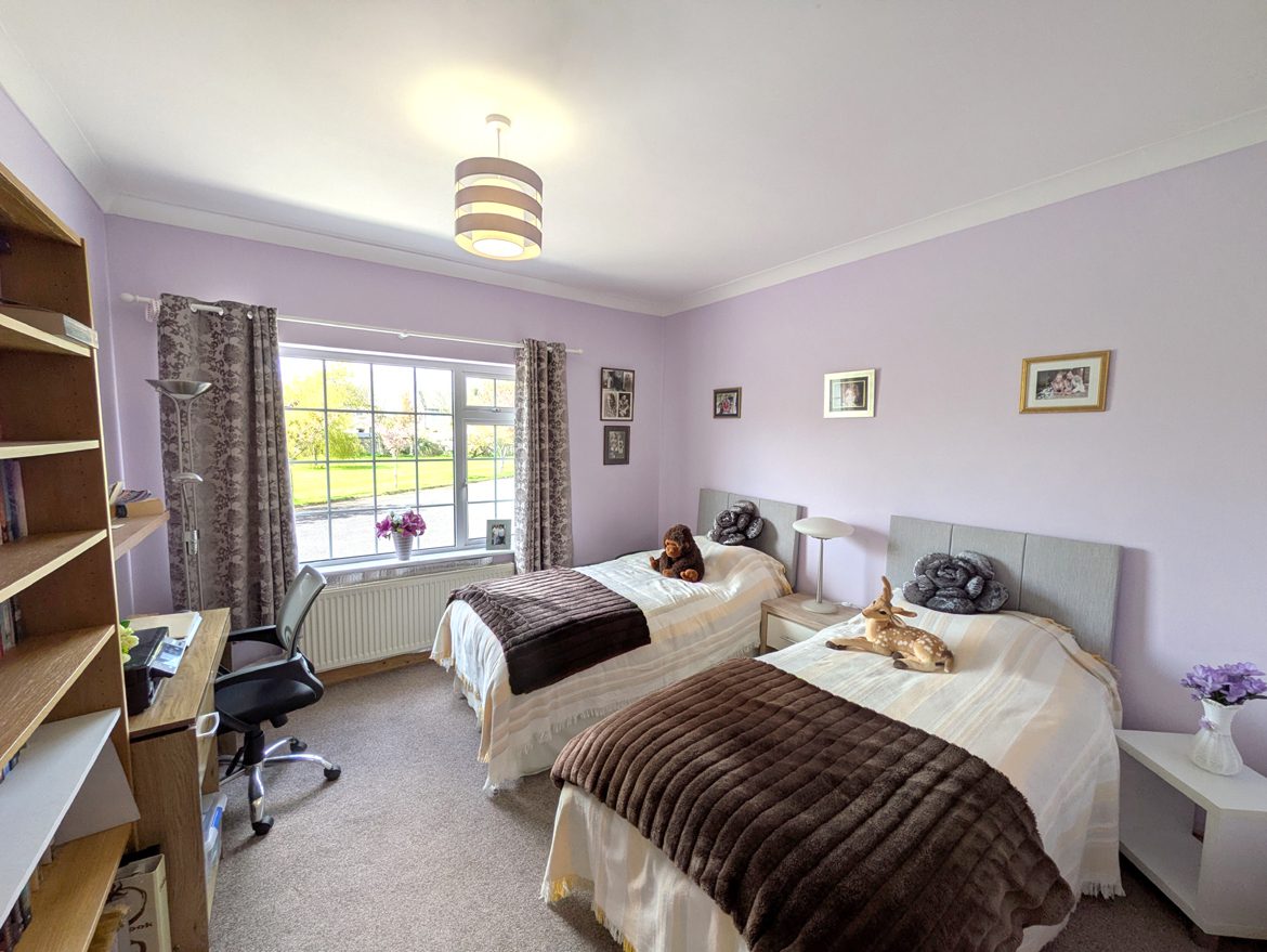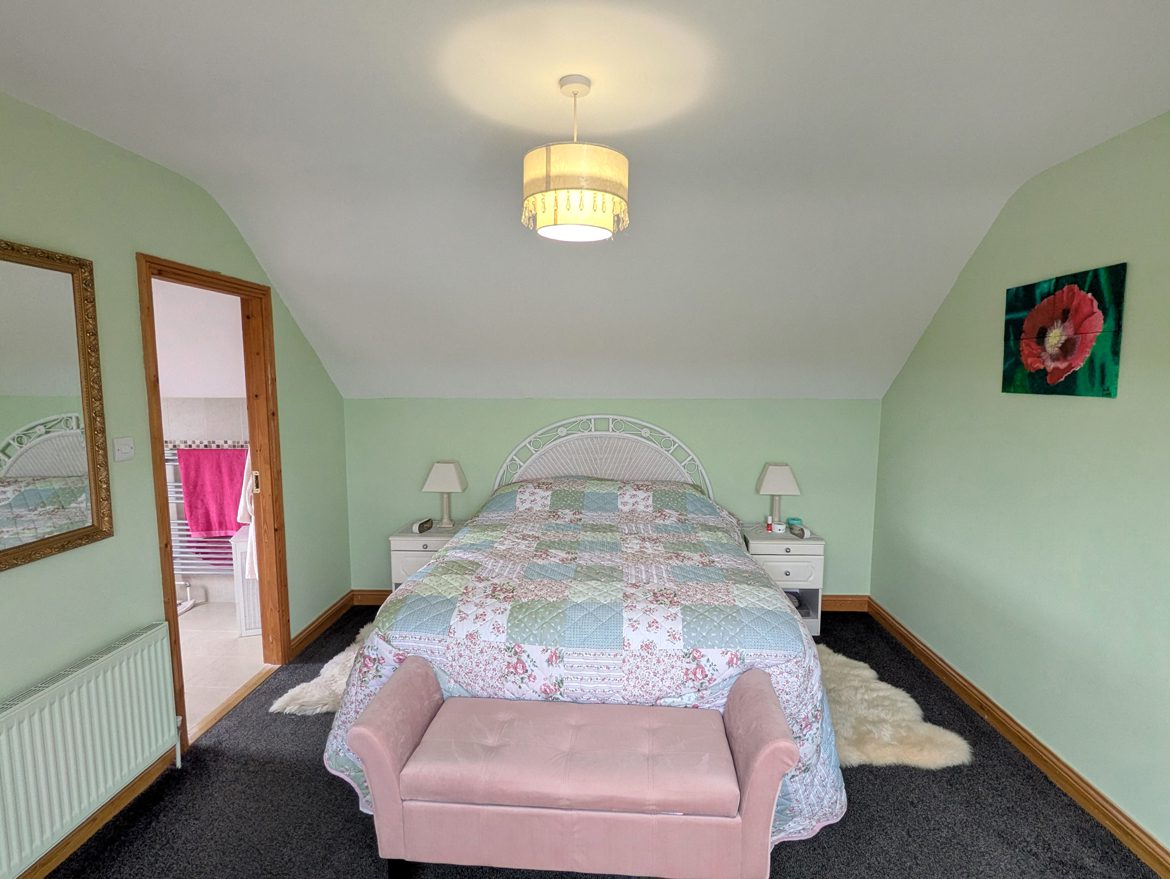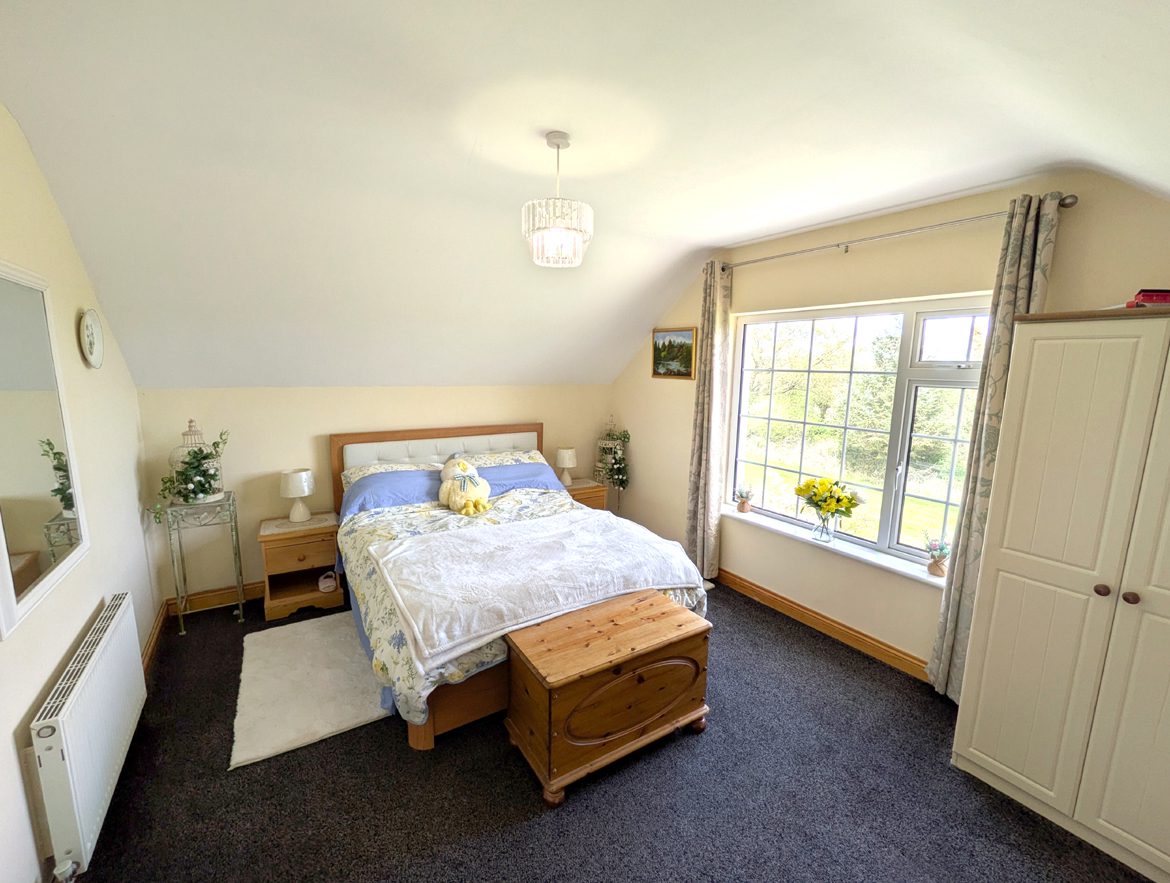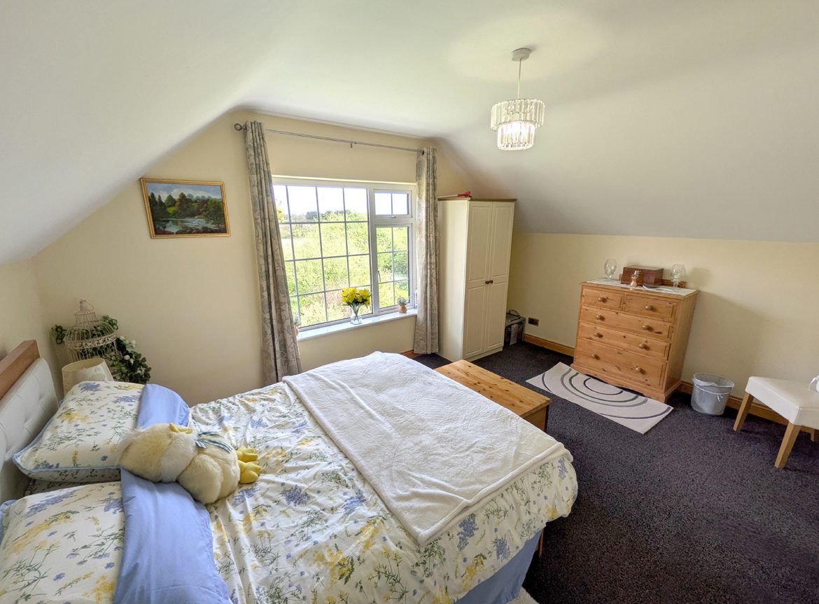 Bedroom 5 – 4.45m x 3.44m carpet flooring, vaulted ceiling and large gable window.