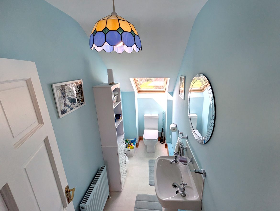Guest WC – 2.89m x 1.19m tile flooring, vaulted ceiling, skylight, WC, WHB.